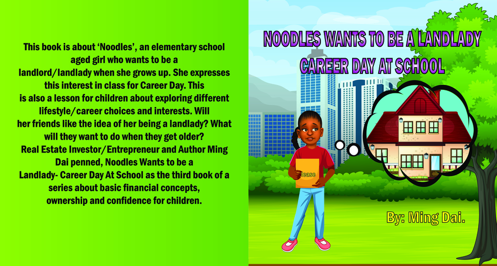 This book is about ‘Noodles’, an elementary school aged girl who wants to be a landlord/landlady when she grows up. She expresses this interest in class for Career Day. This is also a lesson for children about exploring different lifestyle/career choices and interests. Will her friends like the idea of her being a landlady? What will they want to do when they get older? Real Estate Investor/Entrepreneur and Author Ming Dai penned, Noodles Wants to be a Landlady- Career Day At School as the third book of a series about basic financial concepts, ownership and confidence for children.